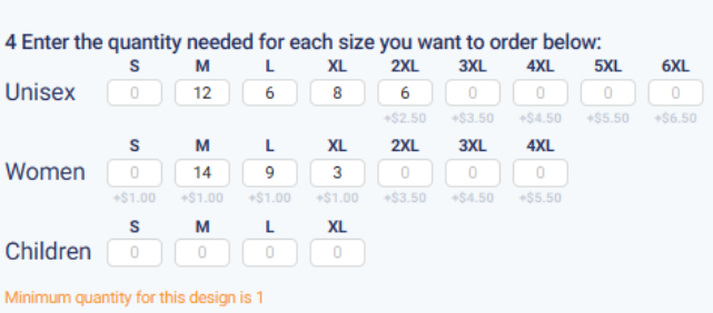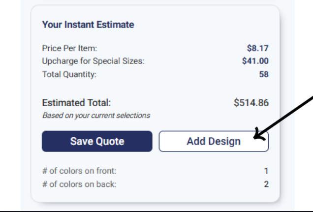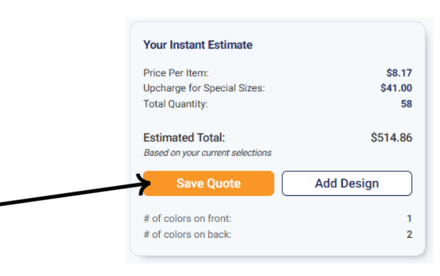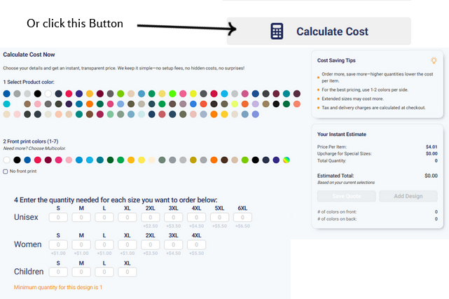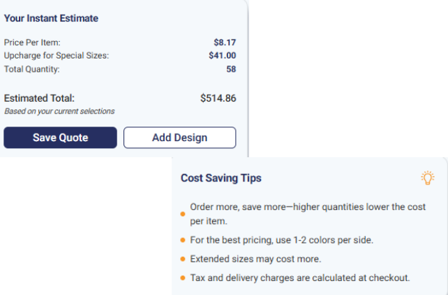 This quick estimate will tell you the price per item, additional cost for special sizing, number of colors/print locations, total quantity of items, and your estimated total.
